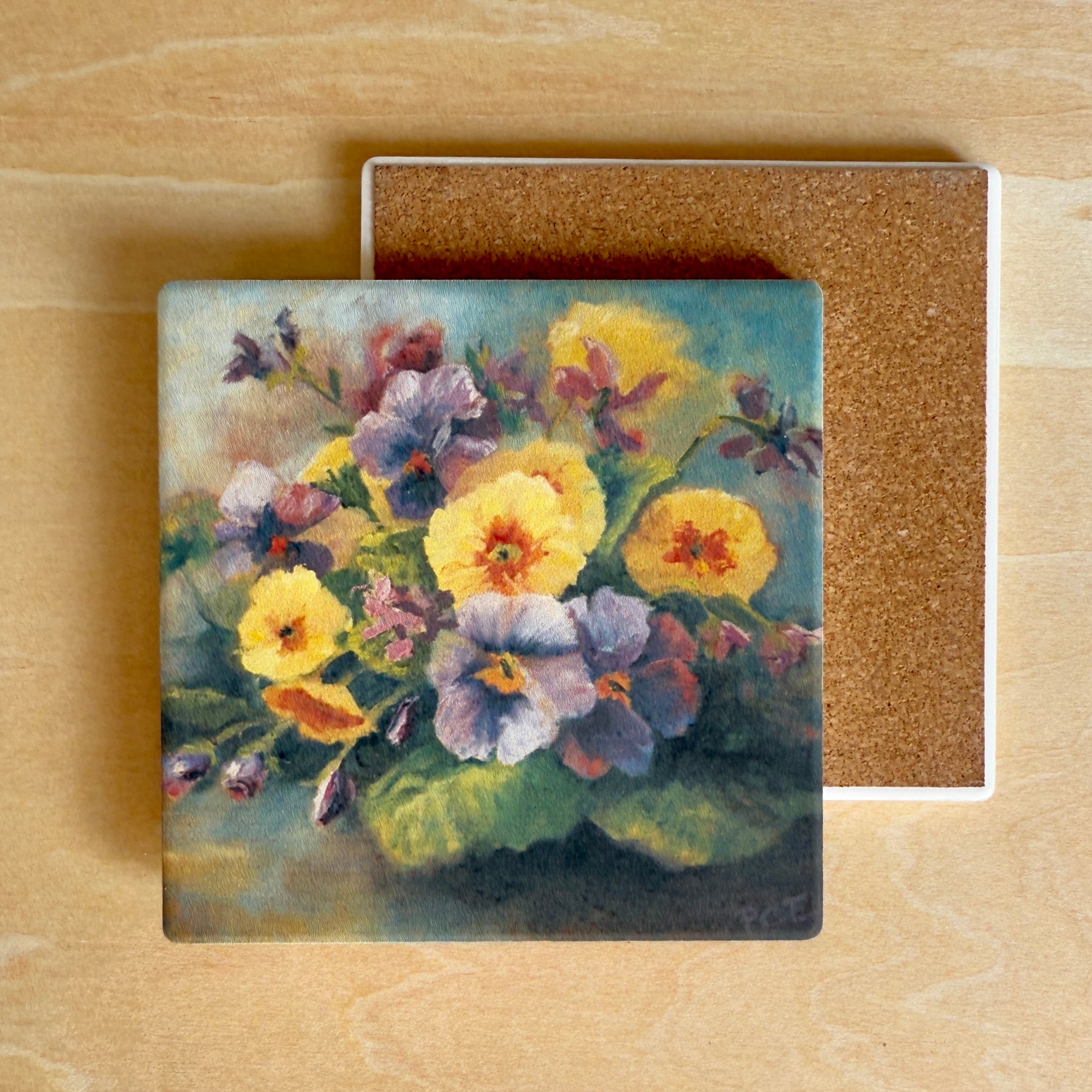 A 4.25" square ceramic coaster featuring Patti Clancy’s original artwork. Matte finish, 100% absorbent, with a cork backing to protect surfaces. Sold individually (or sets of 4)— great on its own or for mixing and matching with other designs.