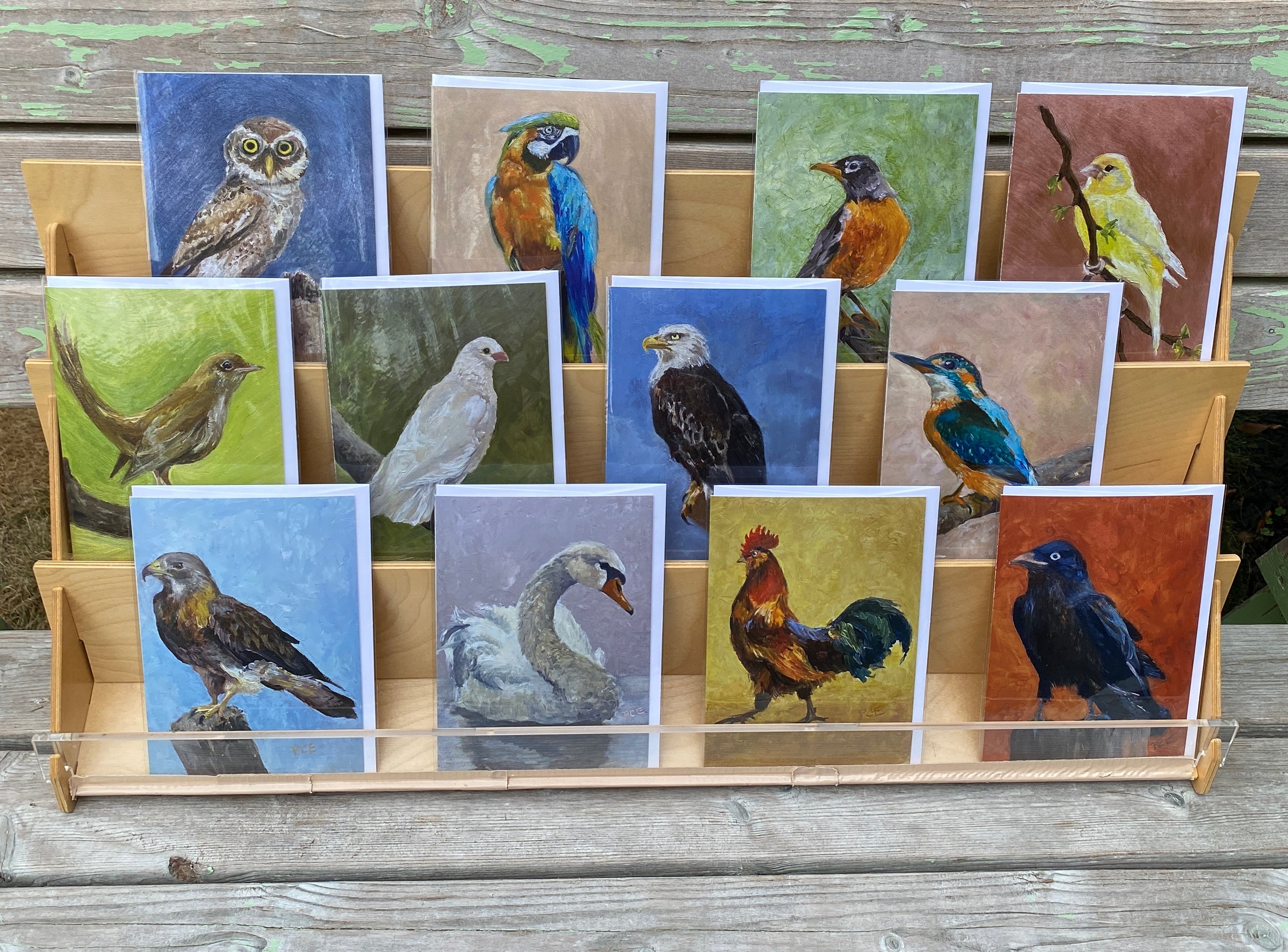 THE PERFECT BIRTHDAY CARD! "Birth Month Bird"© by Patti Clancy. Oil painting reproductions on sturdy card stock. 5x7 cards w/envelope, blank inside, individually wrapped in cello are just the ticket. Includes "people" traits on the back. Unique!