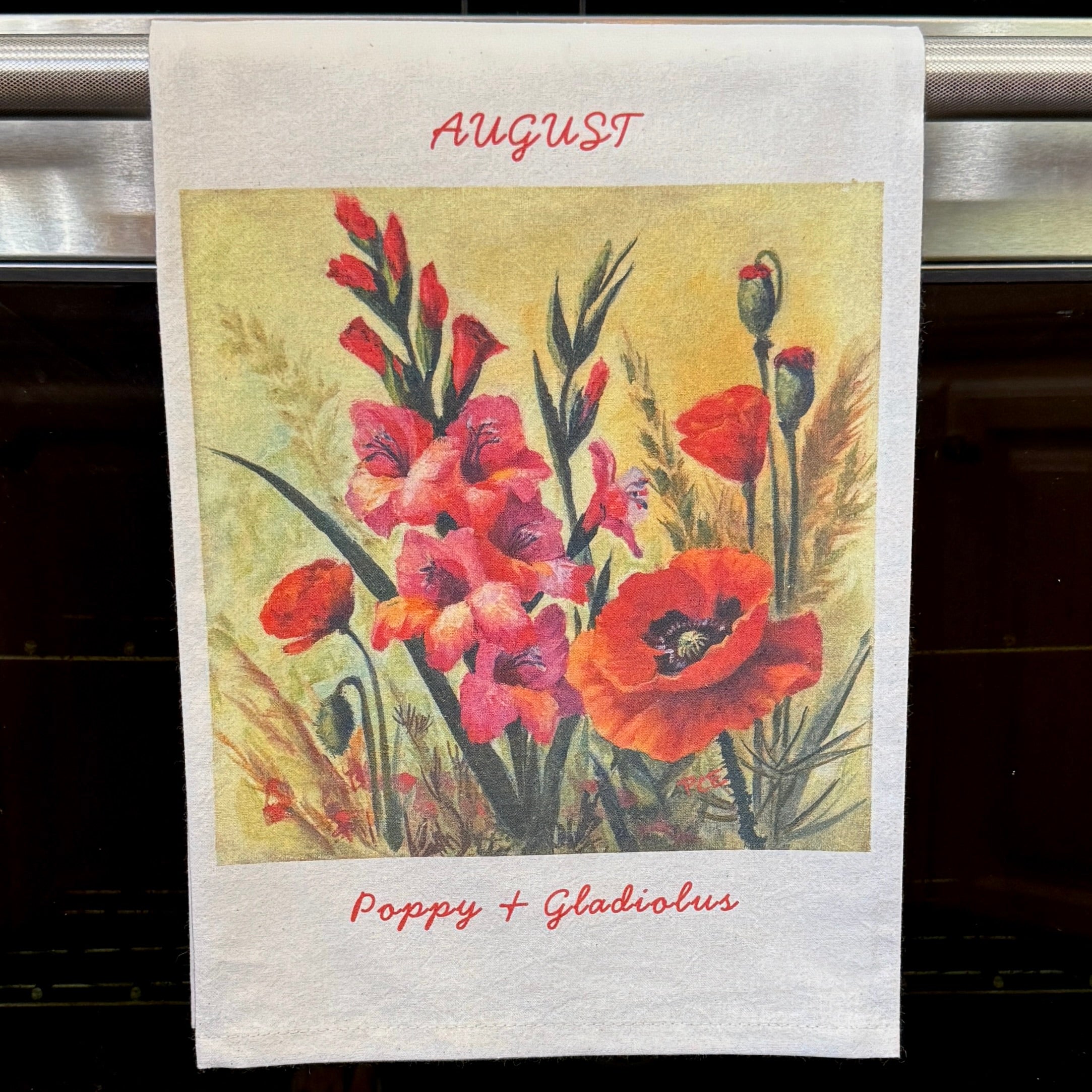 August – Poppy & Gladiolus 27x27” flour-sack towel, soft + absorbent. Original oil painting by Patti Clancy. Poppy - Imagination, remembrance. Gladiolus - Strength of character, integrity. Machine or hand wash with cold water. Perfect for your kitchen or a thoughtful gift. Collectable!