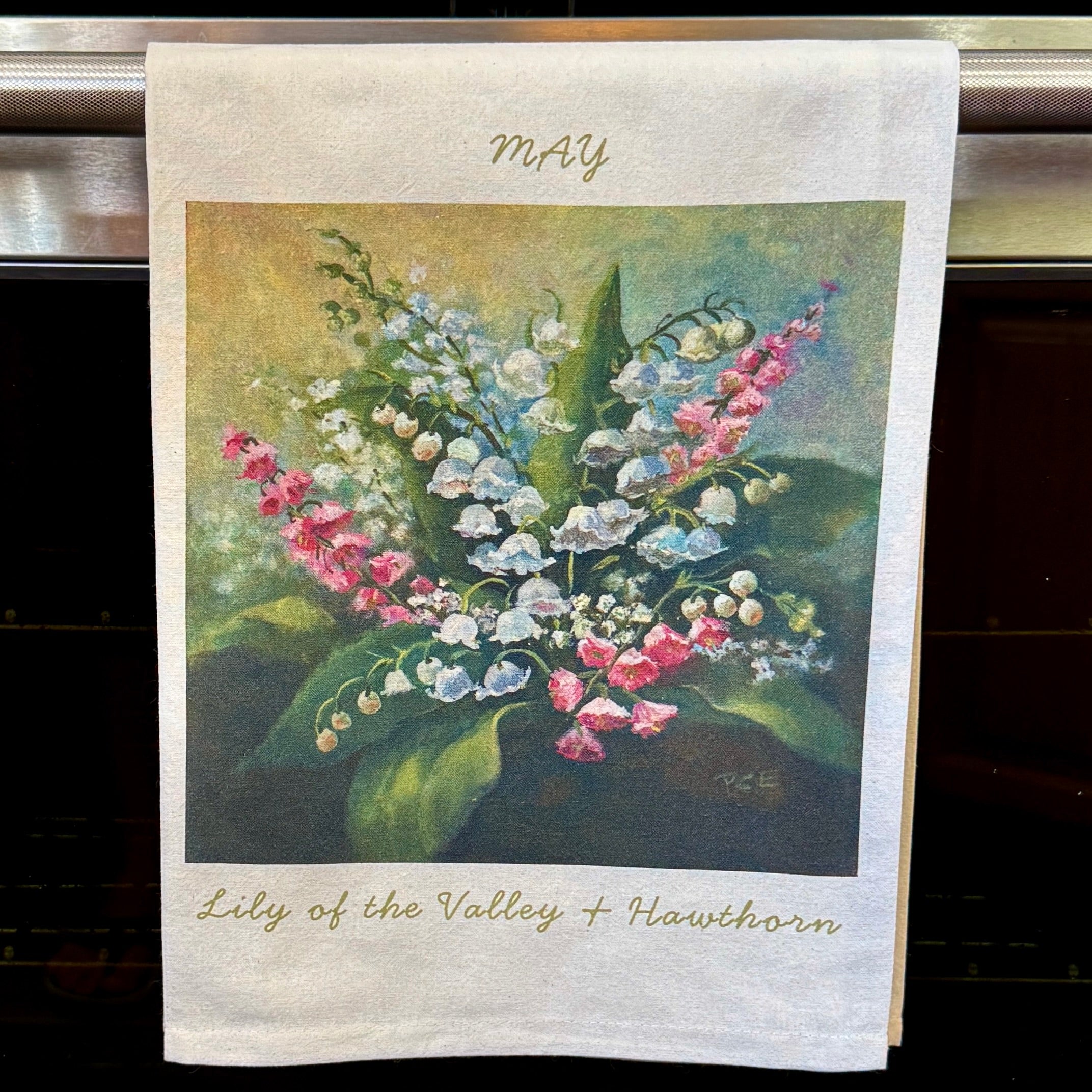 May – Lily of the Valley & Hawthorn 27x27” flour-sack towel, soft + absorbent. Original oil painting by Patti Clancy. Lily of the Valley - Sweetness, humility. Hawthorn - Protection, hope. Perfect for your kitchen or a thoughtful gift. Collectable!