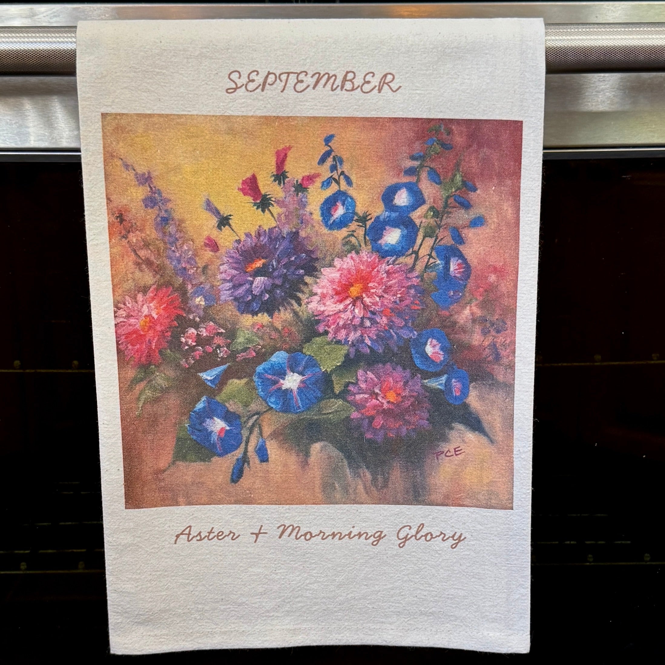 September – Aster & Morning Glory 27x27” flour-sack towel, soft + absorbent. Original oil painting by Patti Clancy. Aster - Wisdom, love Morning Glory - Affection, resilience Machine or hand wash with cold water Perfect for your kitchen or a thoughtful gift. Collectable!